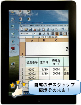 事務所にある自席のPCをiPhone、iPadから遠隔操作することで、『どこでもオフィス』を実現します。